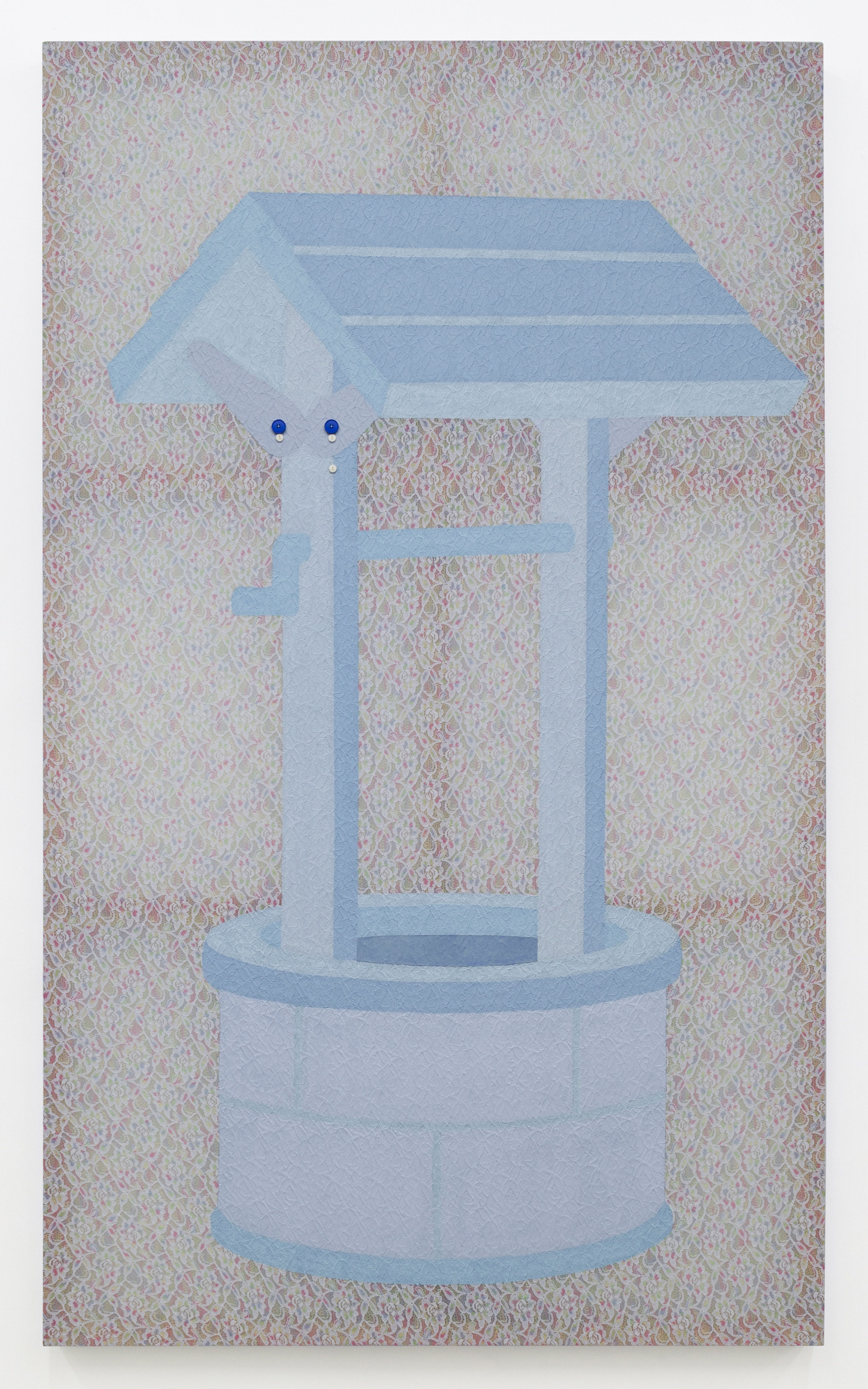 The subject of Zhi Wei’s 2020 work, Boy Sensitive, is a baby-blue-coloured well. The form of the well recalls the wishing well in Disney’s animated movie, Snow White (1937). Segments from such (Disney) films in which the princess sings into the well (or to, more generally, any medium that can reflect her own image) (1) inspired the then Saturday Night Live writer Julio Torres’ 2016 “Wells for Boys” sketch, a commercial parody in which the introverted, “sensitive little boy” Spencer’s favourite toy is a baby-blue ‘Well for Boys’. The sketch has been widely praised as “hilarious, rich, and beautiful” for its compassionate portrayal of boys not fitting the social expectations of masculinity and male gender roles.( 2) Zhi Wei depicts the well on layers of lace and tulle. In the work, there is no sign of Spencer. Instead, the artist has sewn the eyes and teardrops of the absent character onto the well, a gesture at once personifying and personal. On the one hand, the well becomes the personification of a hypothetical mass-marketed toy. But more importantly, this relation with the artist transforms the well into a sort of imaginary friend (or companion to the suffering of “sensitive boys”).