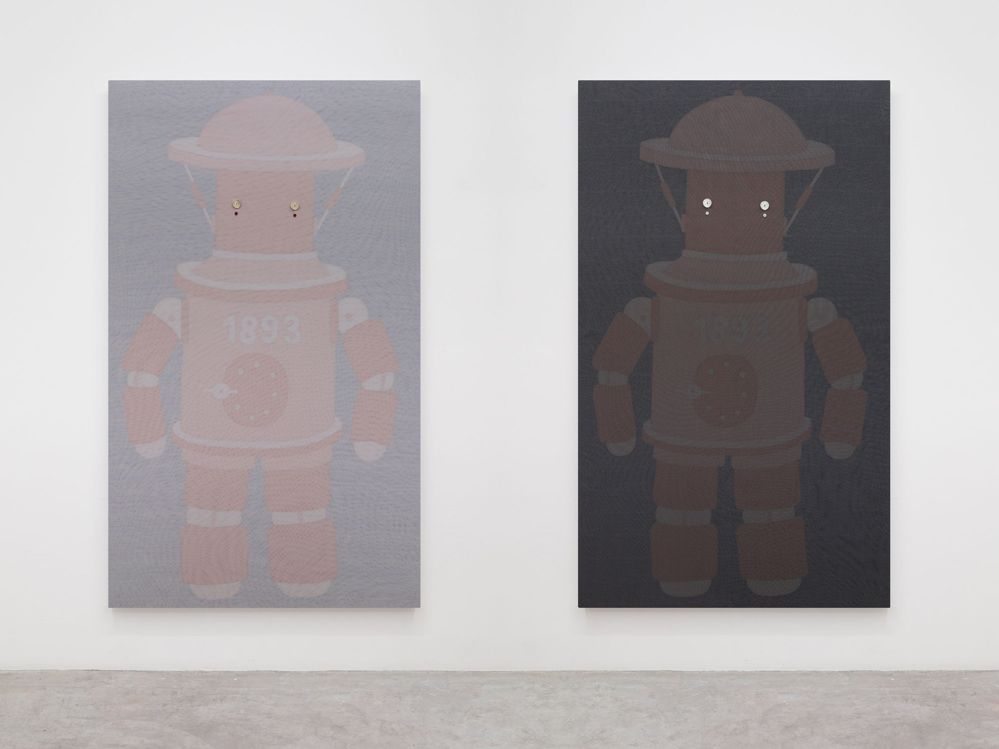 In 2022, Zhi Wei’s Beijing studio was partially destroyed by a fire whose smoke blackened Danny and Jimmy (though, fortunately, the surface textile accidentally protected the painted parts). After replacing the textile, Zhi Wei renamed the two works Danny Revived and Jimmy Revived and added ‘ash’ to the list of materials. Like an attentive friend, they tended to the characters, while recording the disasters suffered by their companions and their eventual rebirth. The vitality that the artist gives to the images also evokes the unique feeling that the viewer has when looking at the Rabbit-Duck illusion or the Necker Cube: the drawings are more than just lines, shapes or colours on a flat surface, but are also crowned as icons, fetishes, and magic mirrors. Referencing toys that require necessarily some sort of human animation, they are objects that, though invested originally by the artist, come to have a lives of their own, able to speak to us and look at us. (6)