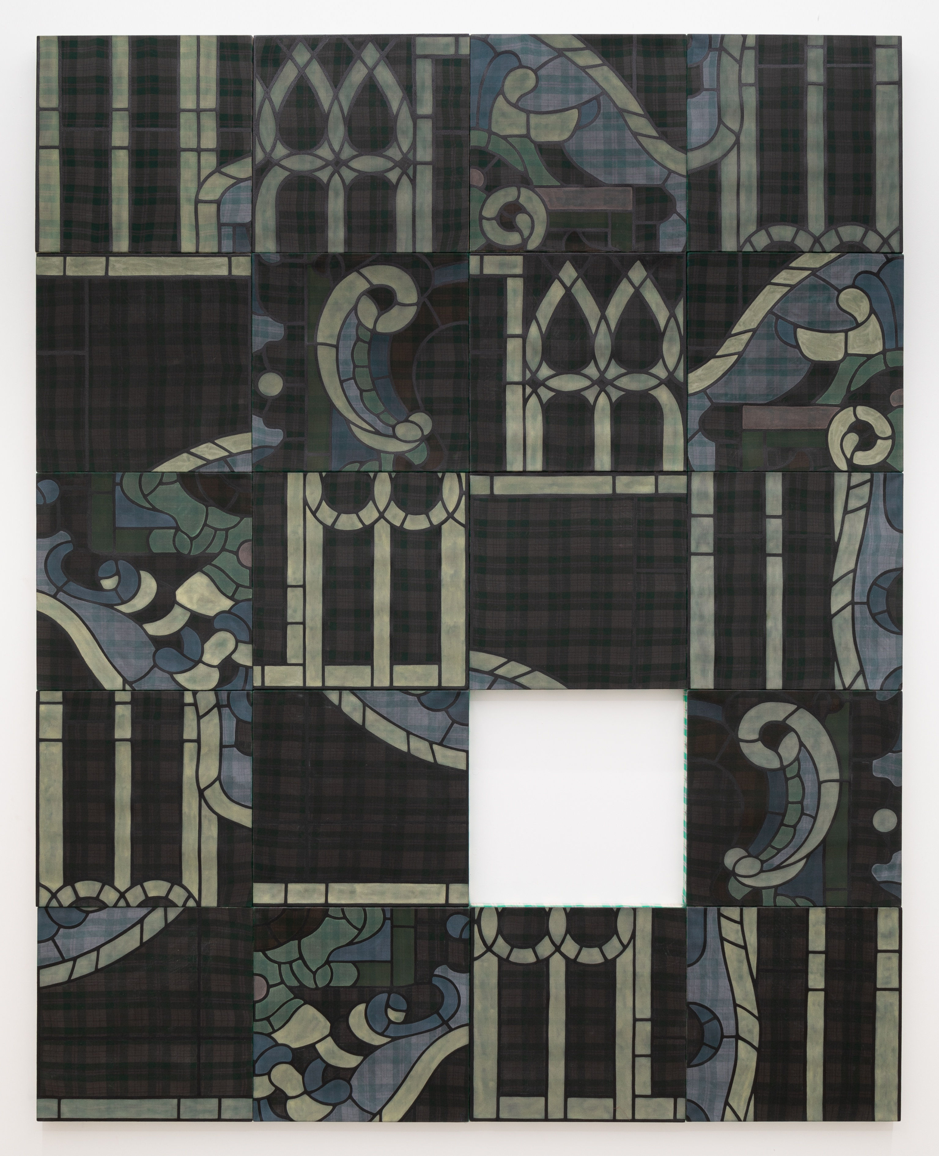 Zhi Wei’s body of work moves between a wide range of references and inspirations, from American variety shows to the illustrations of rare 16th century French manuscripts, and from late 19th century comic strips of New York newspapers (in The Yellow Gown Revived, 2021-2022) to the early 20th century patterned stained glass window at the Peace Hotel in Shanghai (in Window Puzzle, 2021). Zhi Wei’s inspirations travel freely in time and space, are unusual and unexpected, though they resonate with their personal history and coming of age. Their work becomes an anchor within a deluge of information, from their international upbringing in Beijing, Oxford, Shanghai, from books and movies on their tabletop, or from the internet through which they have been formed.