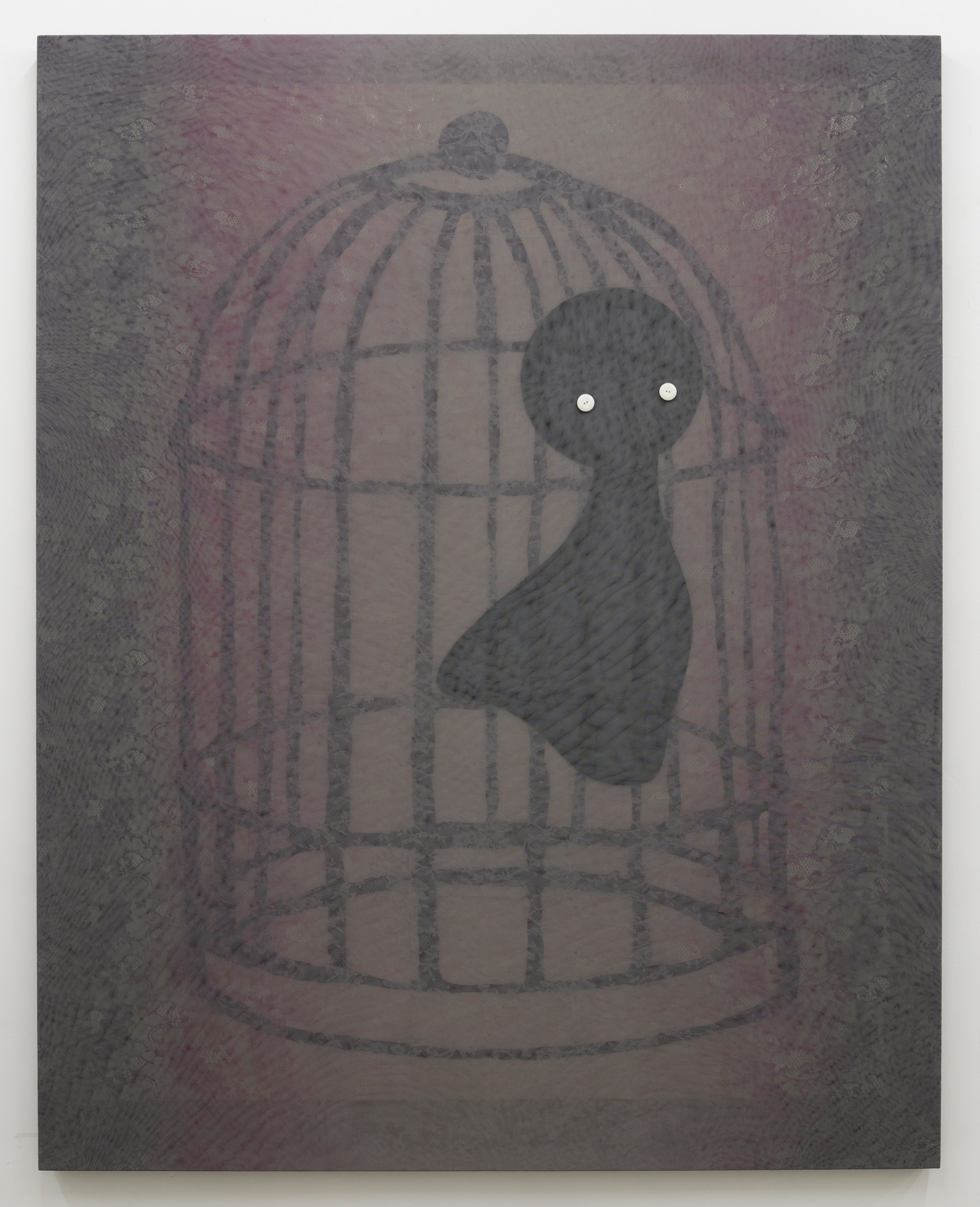 While the artist was growing up, their family ran a clothing and fabric business. Drawing from that legacy, Zhi Wei’s works are also composited of multiple layers of fabrics. Heavier fabrics like jacquard and lighter laces are overlaid to form veils and masks, which often function to create a dazzling ‘moire’ interspersed with the fine glitter of thread and buttons. By introducing fabrics of different transparency, Zhi Wei constructs a liminal space in these bas-reliefs, within which they interweave painted fabrics, stretchers, and other materials (papers, buttons and wooden fittings).